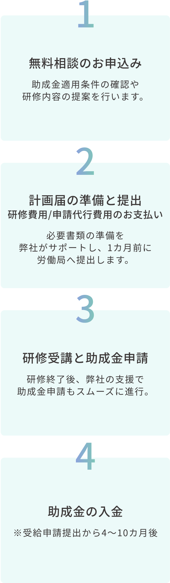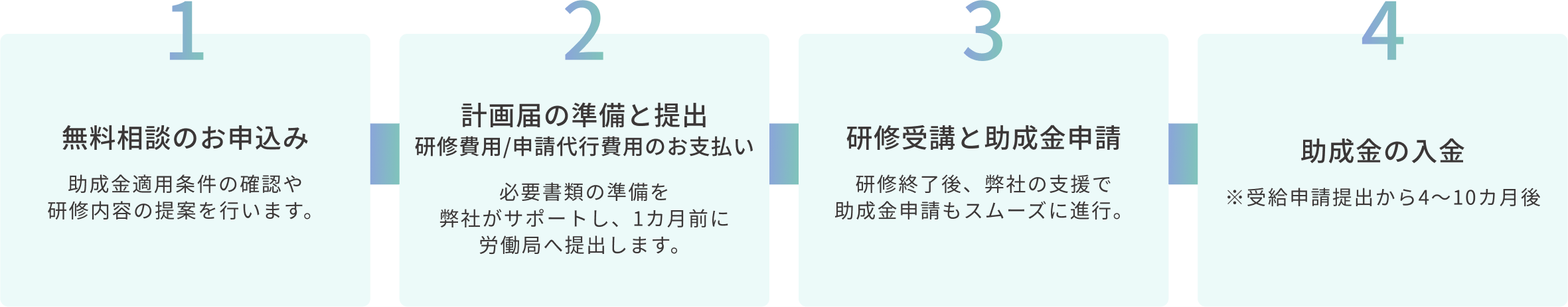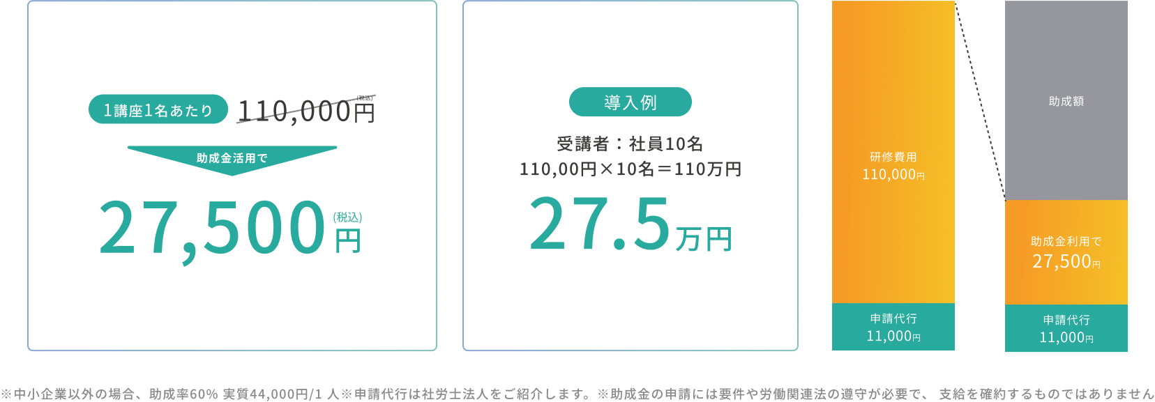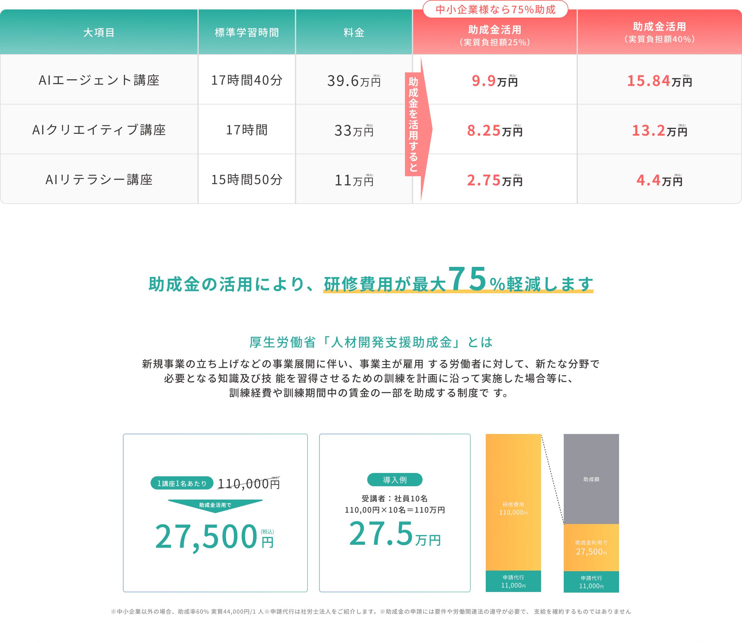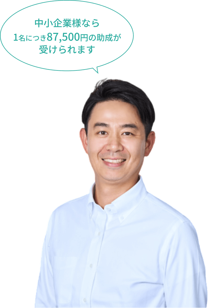 「人材開発支援助成金」を活用することで、最大75%の費用軽減。導入のハードルが低く、少人数からスタートして効果を確認しつつ規模を拡大できます。
